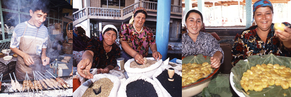 (上)ウズベキスタン、サマルカンドの市場。串焼き肉シャシリクはシルクロード